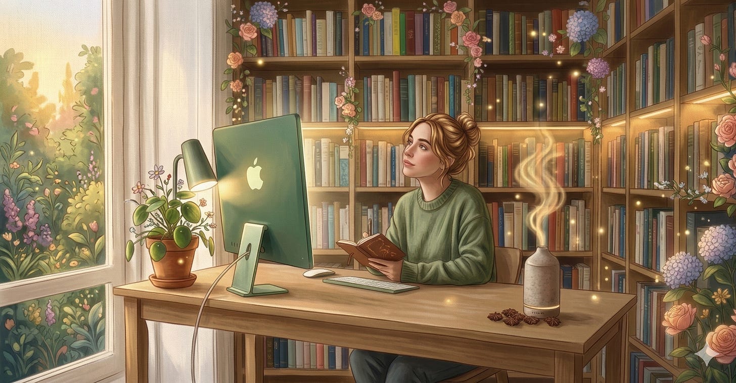 My back is against a wall of books. I have a plant, and flowers from the garden during summer. A star anise diffuser running. Birdsong in the background.