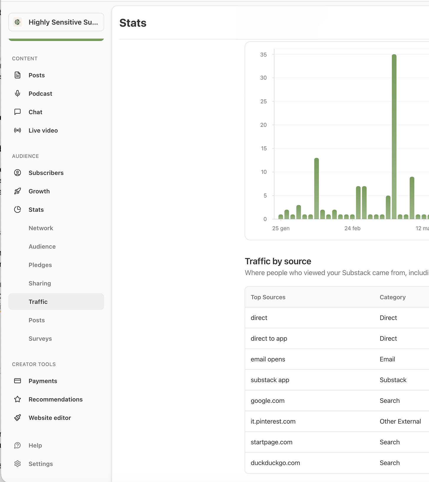You can actually see this inside your Substack dashboard. You click on “Stats”, and then on “Traffic” and it shows where your subscribers are coming from. As you build your Pinterest presence, that referral source starts to appear.